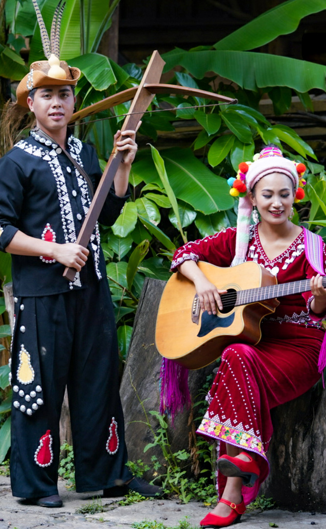 德昂族人口約1.7萬,主要分布在德宏州和保山市的潞西、梁河、瑞麗、隴川、隆陽(yáng)等縣區(qū)。民居多為草排覆頂竹木結(jié)構(gòu)的干欄式建筑,眼前的德昂村建筑納入了能容納數(shù)十人居住的德昂大房子,氈帽頂?shù)男》孔?,還有頗具浪漫色彩的大公房、小公房……還建有“龍陽(yáng)塔”標(biāo)志及佛教奘房、佛塔。德昂族民間普遍信奉南傳佛教,民俗活動(dòng)與佛事活動(dòng)關(guān)聯(lián)緊密。潑水節(jié)、開門節(jié)、關(guān)門節(jié)是重大節(jié)日。德昂族服飾色彩豐富,口頭文學(xué)特別是民歌創(chuàng)作活動(dòng)...